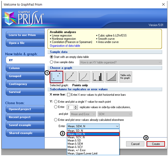 'PRISM' 프로그램을 키면 상단 그림과 같이 나오는데, ① 'Graph' 클릭 - ② (Mean, SEM, N) - ③ 'Creat' 순으로 클릭해서 프로젝트를 생성합니다