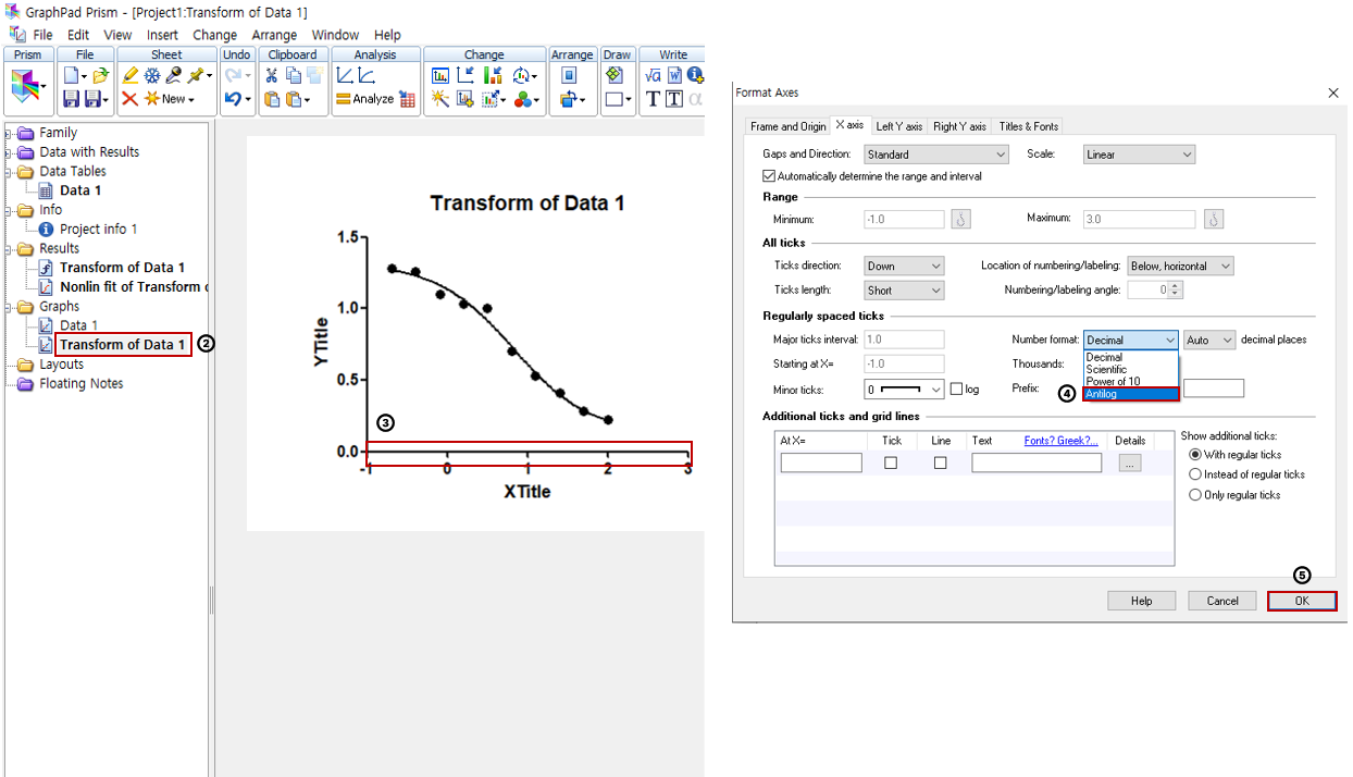 ③ 그래프 x축을 더블 클릭하면 그래프 축을 수정할 수 있는데, ④ 더블 클릭 후, 'X axis' - 'Number formal' - 'Antilog' - 'OK' 클릭