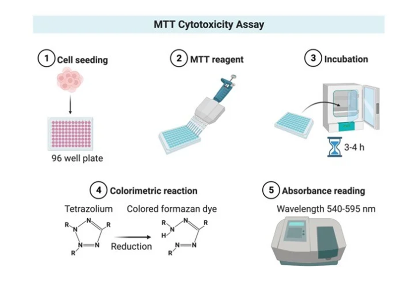 MTT assay는 살아있는 세포의 미토콘드리아에서 MTT에서 보라색의 formazan으로 환원되는 정도를 측정하는 방법으로, 세포 내 반응/formazan 용해/흡광도 측정 으로 이루어 집니다.
